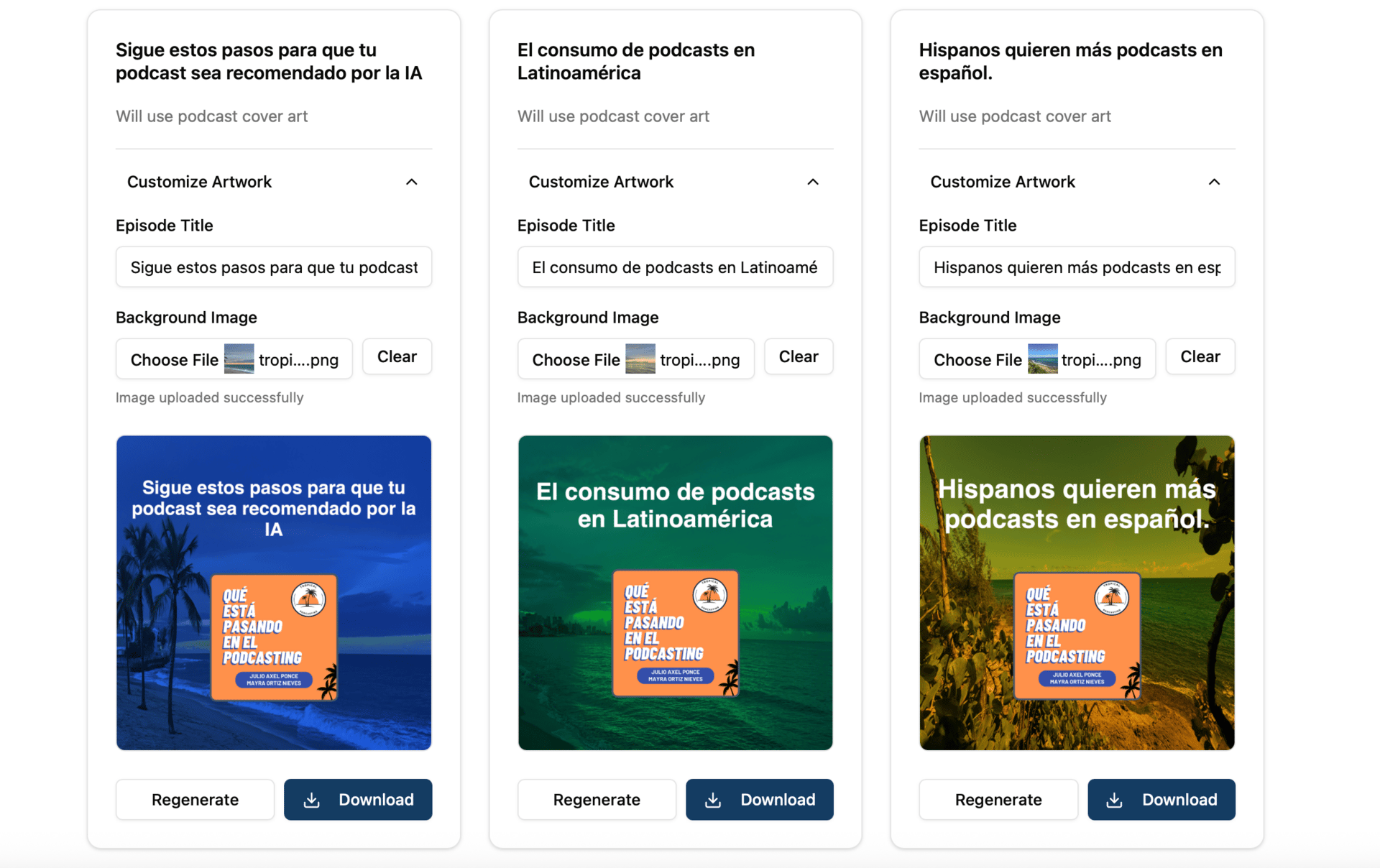 La gente de Transistor.fm lanzaron esta semana una herramienta gratuita que te permite generar arte personalizado para tus episodios automáticamente. La aplicación te permite escoger colores de fondo, subir fotos de fondo también y hasta editar el titulo del episodio. Así se ven los últimos tres episodios de Qué Está Pasando en el Podcasting.